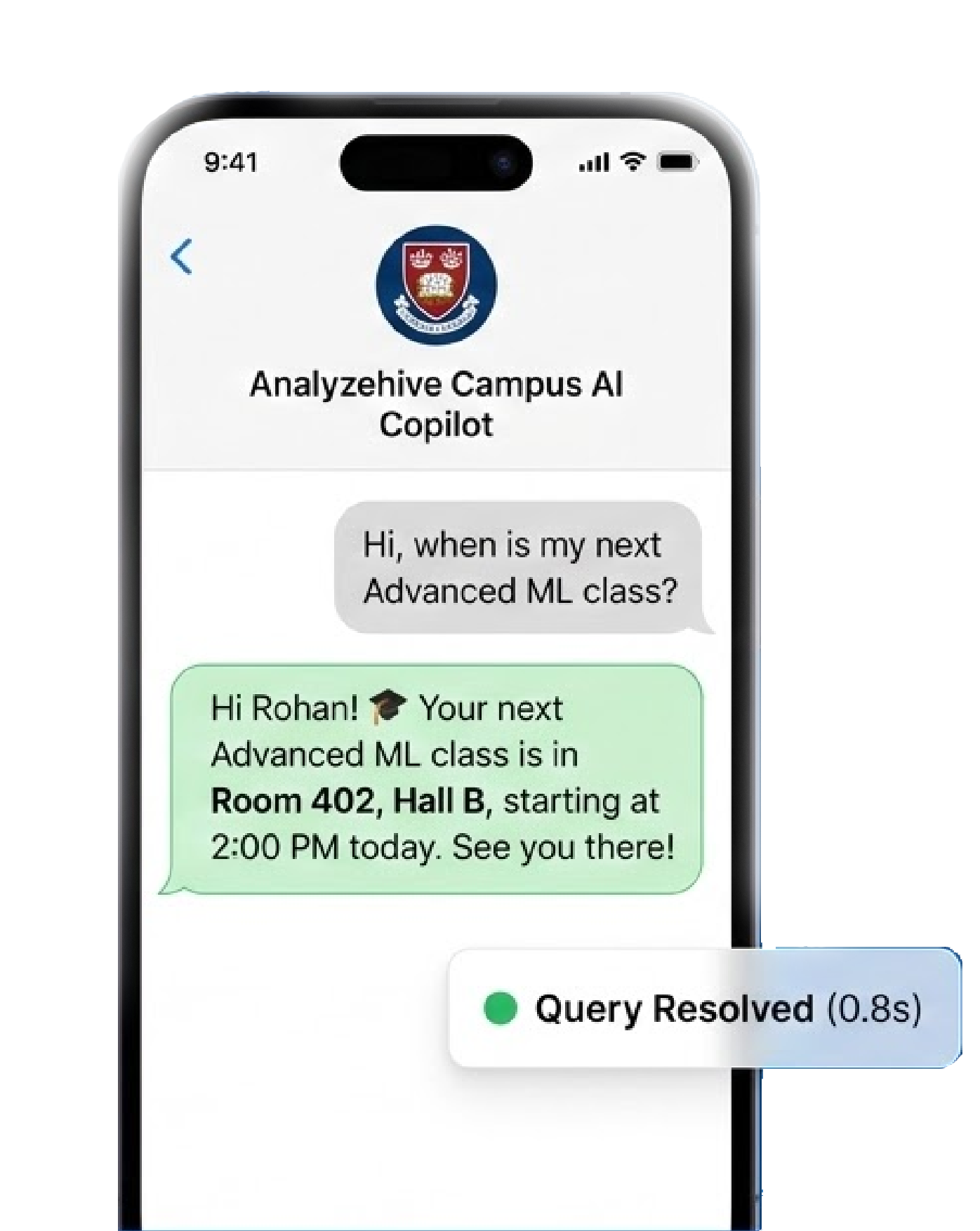 Eliminate administrative bottlenecks and protect your tuition revenue. Analyzehive Flow provides the intelligent infrastructure required to automate admissions, resolve student queries 24/7, and free your faculty to focus on high-level mentoring.