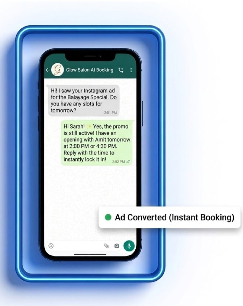 Stop wasting budget on clunky website forms. We build highly targeted Meta and Google campaigns that bypass standard landing pages, dropping leads directly into an automated WhatsApp booking flow.